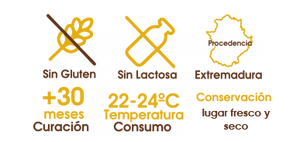 Procedentes de cerdos criados en libertad en nuestras extensas fincas de Extremadura, rodeados de pastos naturales. La selección genética de nuestra ganadería unida a una cuidada alimentación y al ejercicio físico diario hacen de estos jamones un delicioso manjar. De caña fina y pezuña desgastada por los largos paseos, su carne, de tonos que van entre el rojo purpura y el cereza se ve infiltrada por ligeras vetas de grasa que le dotan de un sabor dulce y penetrante. Con una curación de más de 30 meses en nuestras bodegas naturales, sus aromas y su elegante paso por boca no dejan indiferente a quien lo prueba.